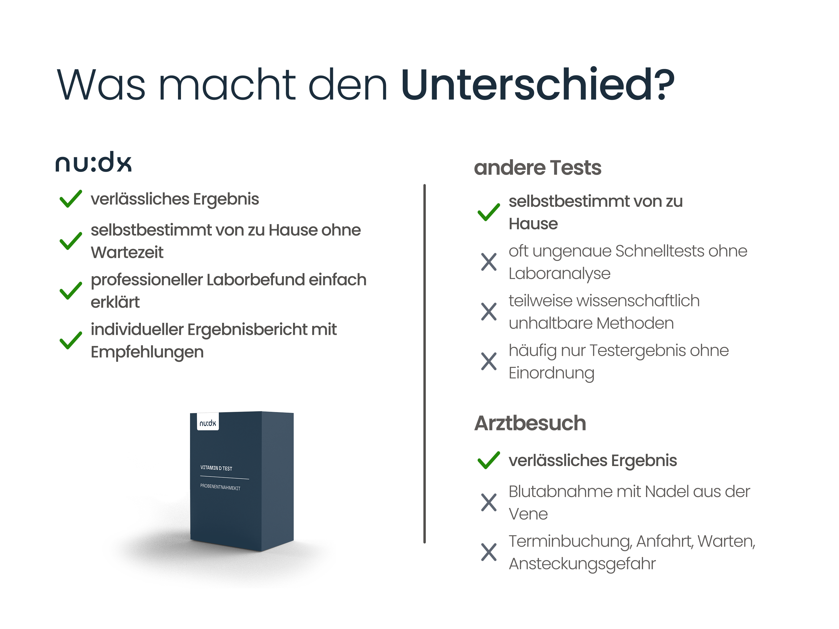 Mit unserem Test kannst Du bequem von Zuhause aus feststellen, ob Deine Werte im grünen Bereich liegen. Der Test liefert Dir einen professionellen Laborbefund, und ein ausführlicher Ergebnisbericht erklärt Dir verständlich, was Deine Werte bedeuten und welche Schritte Du unternehmen kannst, um Deine Versorgung zu optimieren.