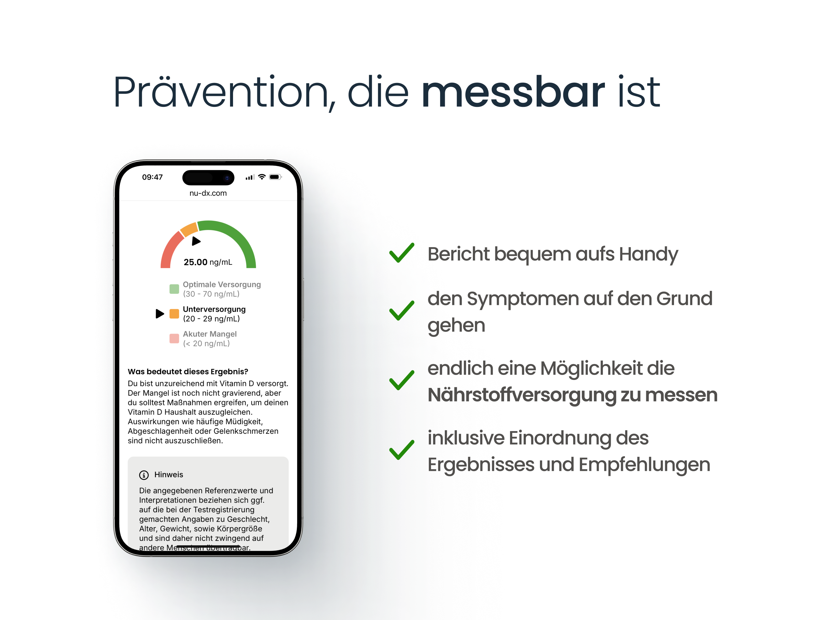 Mit unserem Test kannst Du bequem von Zuhause aus feststellen, ob Deine Werte im grünen Bereich liegen. Der Test liefert Dir einen professionellen Laborbefund, und ein ausführlicher Ergebnisbericht erklärt Dir verständlich, was Deine Werte bedeuten und welche Schritte Du unternehmen kannst, um Deine Versorgung zu optimieren.