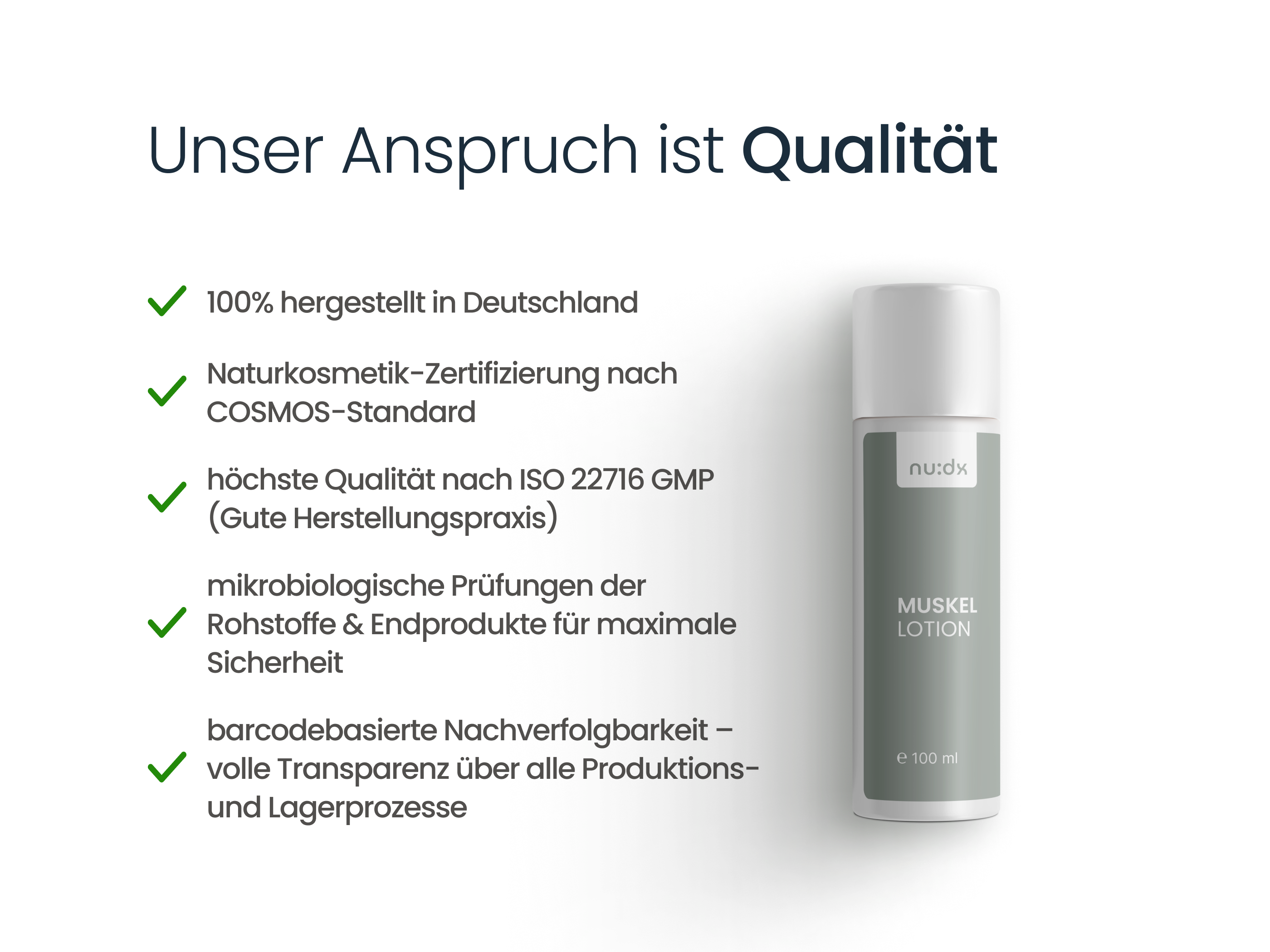 Die Muskel Lotion wurde speziell entwickelt, um die Regeneration nach sportlicher Betätigung und anderen körperlichen Anstrengungen zu unterstützen. Durch ihre natürliche Formel wirkt sie wohltuend bei müden Beinen und verspannter Muskulatur. Dank ihrer leichten und schnell einziehenden Textur ist sie der perfekte Begleiter für aktive Menschen. Ob auf Wanderungen, Fahrradtouren oder in der Sporttasche – die handliche Lotion ist immer griffbereit und unkompliziert in der Anwendung.